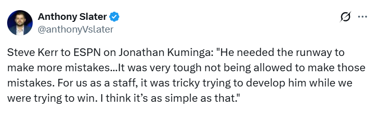 “我觉得对所有人来说,这都是一个艰难的处境,”科尔说道,“他刚来时技术非常粗糙,而我们当时仍在全力冲击总冠军。他需要足够的空间去犯错,需要在 NBA 赛场积累经验,去真正理解这个联盟的内涵。对他而言,不被允许犯错的滋味很难熬;对我们教练组来说,一边要争冠,一边还要培养他,这也很棘手。事情就是这么简单。”